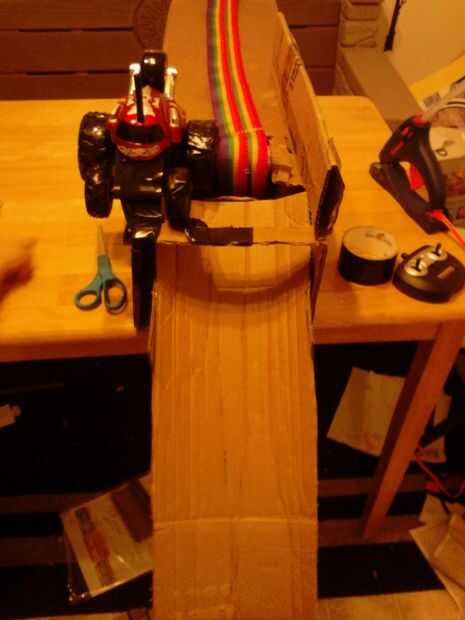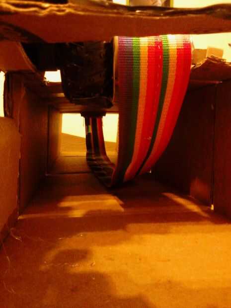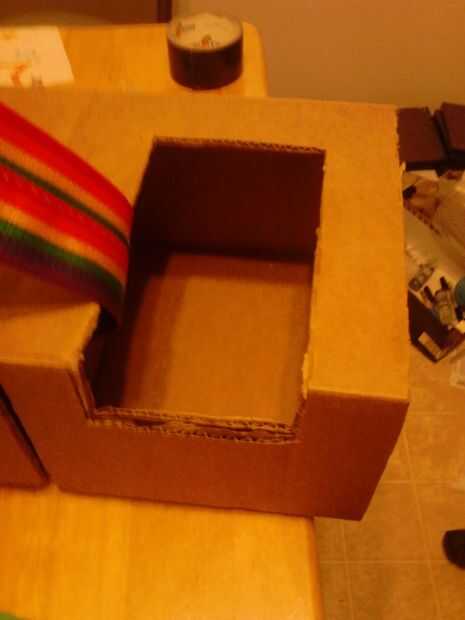 Pruebe el ajuste insertando el extremo de la base y el ángulo de la prueba. Averiguar cómo altura necesitamos hacerlo a pie. Corte otra tira de cartón y doblar en un arco. Coloque en la parte superior de la tolva para que levanta la tolva. El ajuste de prueba y cuando se sienta a la altura correcta lo pegue en el conducto. (fotos 38-41) Inserte el tubo en la base y probar todo a ver si las galletas se la correa y abajo del conducto.