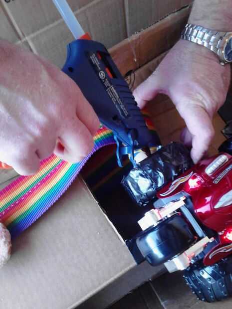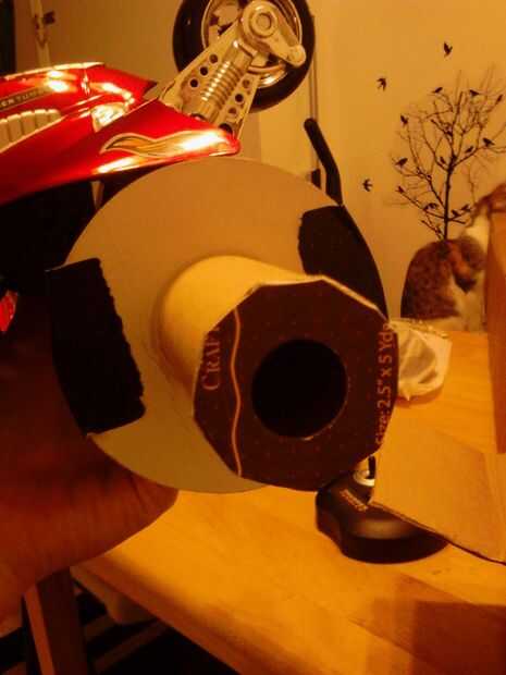 Recortar el otro lado de la bobina conectado al coche para que la cartulina final es sólo un poco más alto que el centro del carrete para permitir las cookies más amplias pasar. (Foto 14) Mina demasiado lejos y se tuvo que construir hacia arriba un poco con capas de pegamento caliente