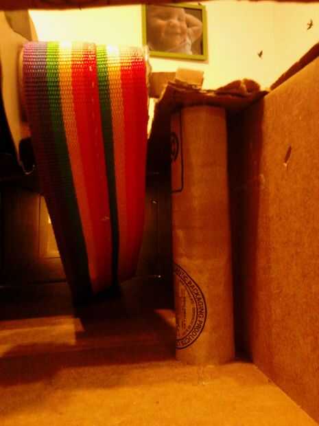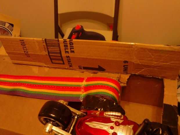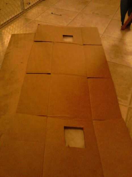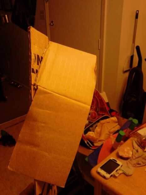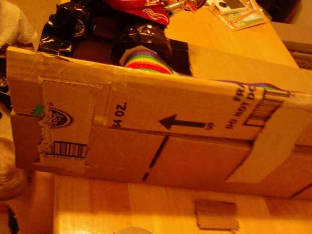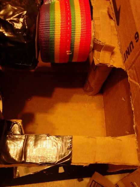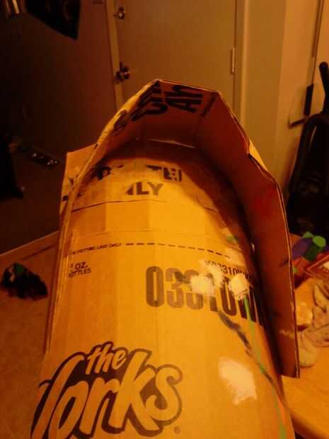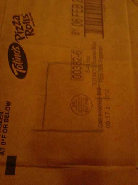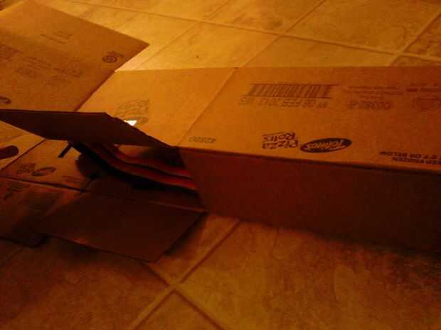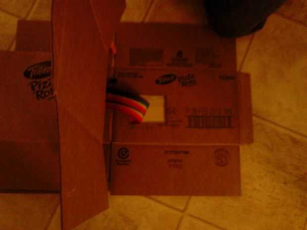 Para terminar el base consigue la segunda caja de pizzarolls y corte o desgarro como hicimos la primera de ellas para hacer una pieza larga. La pongo y tire hacia arriba de las aletas. Coloque la pieza superior con la cinta sobre la segunda caja y Hale las aletas hacia abajo. De esta manera deben solaparse las aletas de ambos cuadros y esto debe hacer un largo arco abierto terminada de clases. Caliente pegan las solapas. (fotos 9 + 10)
