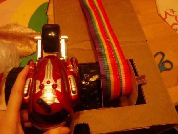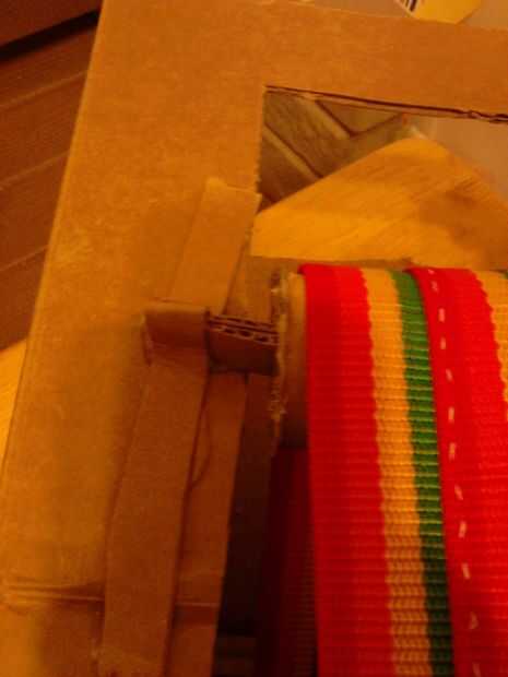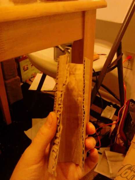 La base necesita apoyo un poco en el interior del lado derecho. Tomar una tira de cartón y convertirla en una columna usando la misma técnica que antes para las piernas. Corte a tamaño, inserción y pegamento caliente en su lugar. (foto 31 y 32)