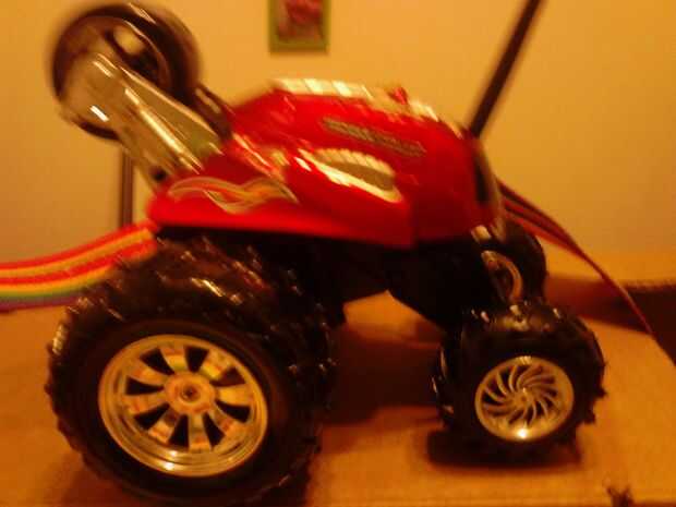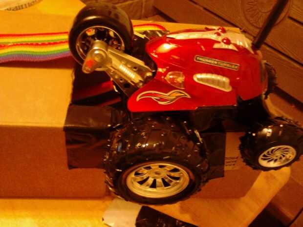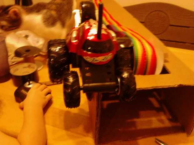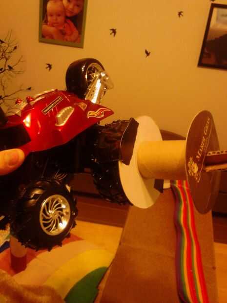 Ahora poner en el coche. Tomar un carrete y pato cinta adhesiva a un neumático trasero del coche de control remoto. Pato cinta adhesiva completamente alrededor del carrete firmemente para que los bordes del carrete están doblados hacia atrás, hacia la rueda así que no consigue de la forma cuando se agregan las galletas.