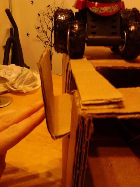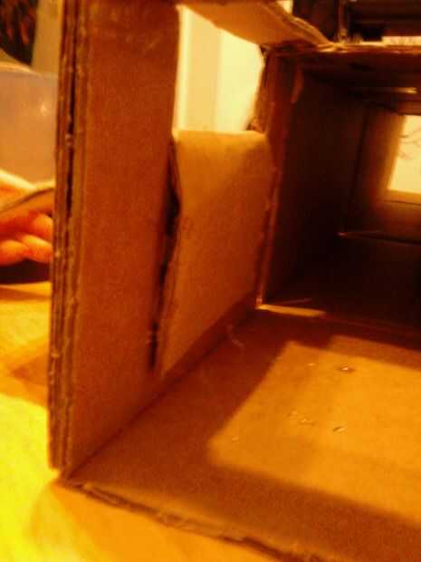 Haz una tira larga y amplia de cartulina y dóblalo por la mitad. Pegue los extremos juntos para hacer una pared delgada. Coloque en ángulo para dirigir la galletas y pegamento caliente en su lugar. Otros dos tiras más pequeñas y utilizarlas como apoyos en el exterior de la base para sostener la pared. Ver las fotos de 33-35. Esta pared todavía no estaba funcionando al 100% del tiempo así que hemos añadido otra pared más pequeños. (foto 36)