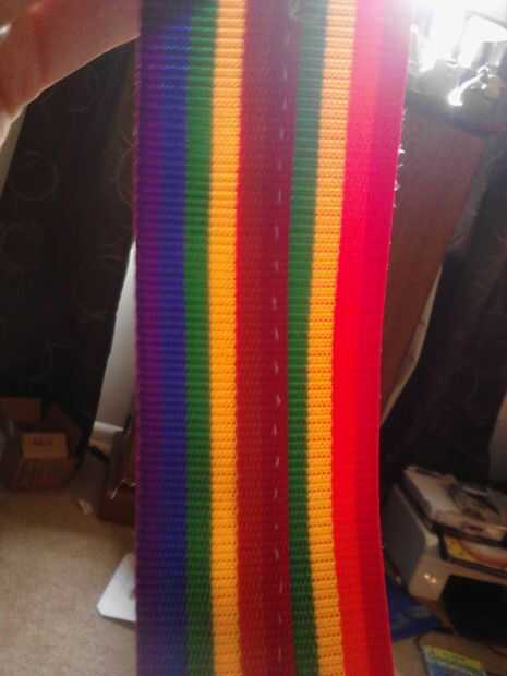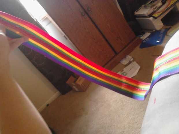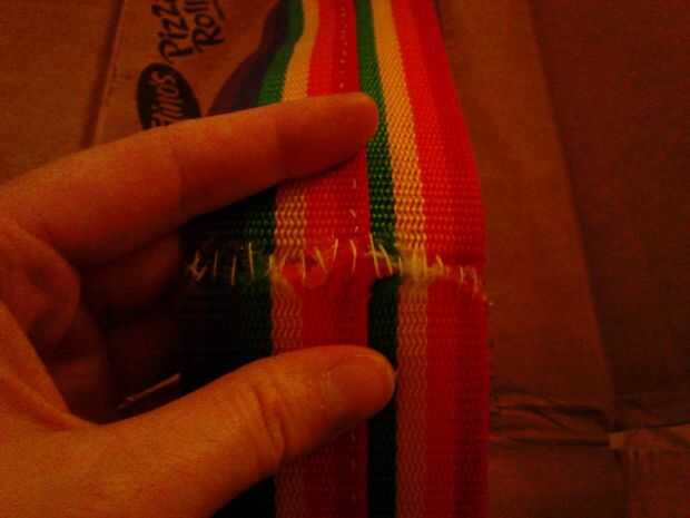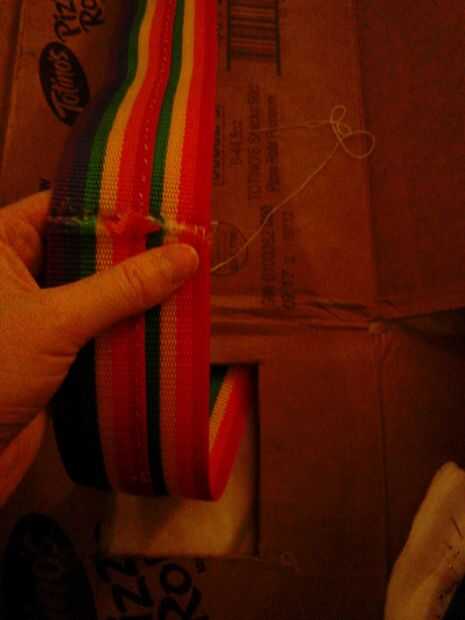 Ahora pase la cinta por los agujeros. Poner una línea de pegamento caliente en el borde del extremo de uno de los extremos y presionar en el otro extremo para hacer un cinturón. Mantenga presionado hasta que el pegamento esté seco. Ahora usar hilo y aguja para coser los extremos juntos para el asimiento adicional. (fotos 7 + 8)