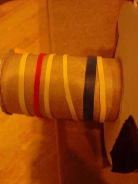 Necesitamos algo para ir a través de los carretes que les permiten girar y sujetar en su lugar en la base. Cortar una pequeña tira de cartón, anotar por la mitad longitudinalmente un pliegue sobre. luego deslícelo a través de la bobina. Debe dimensionarse para permitir que la bobina gire libremente y se extienden desde un lado del orificio al otro. Hacer esto para ambos carretes. Estas piezas se sientan a un lado por ahora.