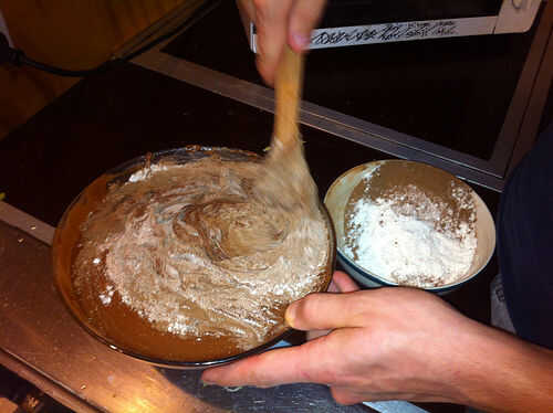 ahora con la cuchara de madera, doble lentamente la harina y el cacao en polvo a la sopa de chocolate.