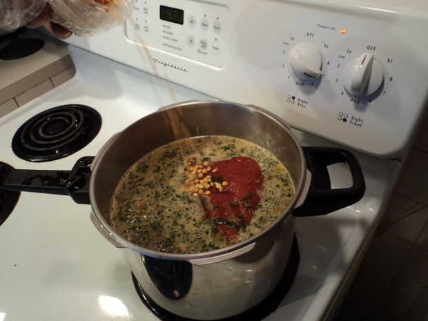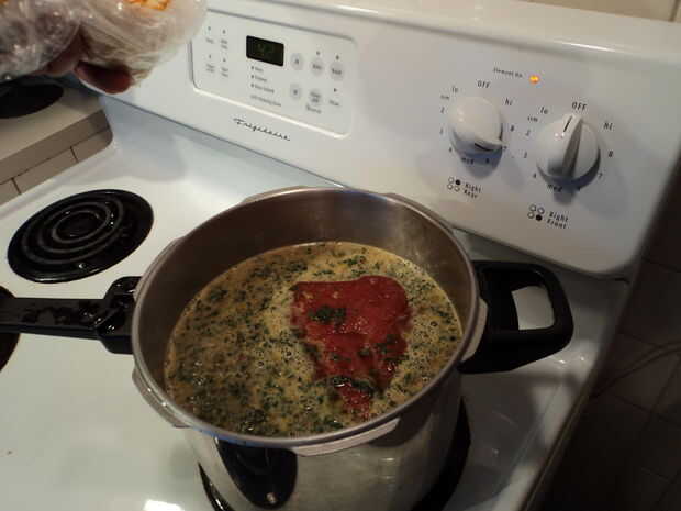 4. Ya que esta sopa cocinar para otro 2 horas que opté por usar mi tomate congelado de mi cultivo de invernadero de verano, aproximadamente 2 tazas. En el bote va, listo para la adición de ingredientes y líquidos adicionales.  Con un producto congelado o conservado de hecho no tiene ningún sentido tratar de sudar en este sabor, sólo no va a suceder.