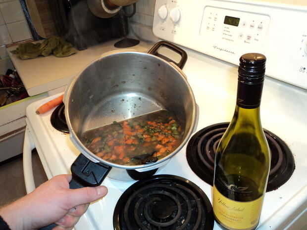 3. Yo entonces líquido a la olla con una taza de vino blanco, y unos 4 litros de agua