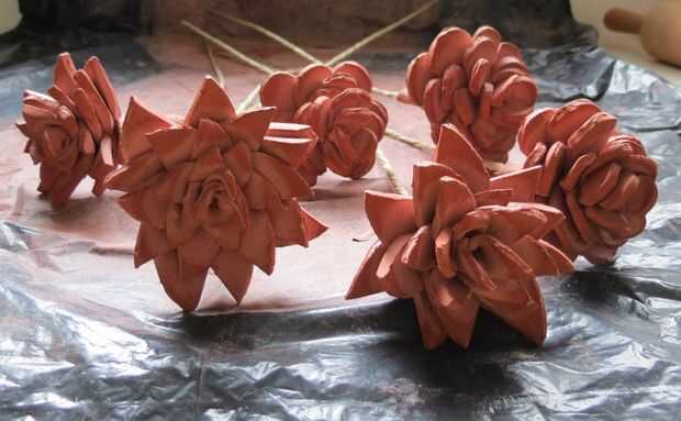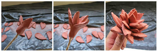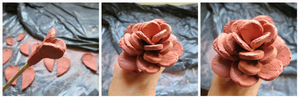 5 para suculentas con punta redondeada, presione el lado puntiagudo de las piezas de medio corazón en la base alrededor de la guita por cable. Añadir cada pieza de medio corazón, uno a la vez para crear volumen.