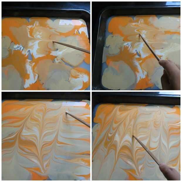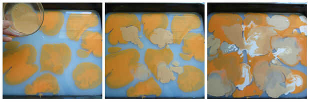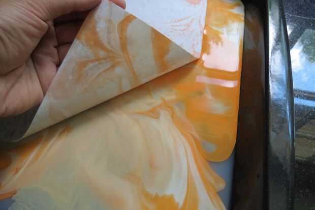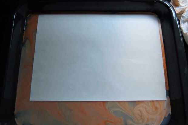 Rellenar el pan con almidón líquido. Combina la pintura acrílica con agua para una consistencia líquida. La pintura acrílica por cuenta propia es demasiado pesada y se hunde en el almidón líquido. El agua ayuda a la pintura con flotando en la superficie del almidón líquido. Puede que necesite experimentar con la consistencia que trabaja para su papel porque papeles más ligeros de peso tienden a no absorber la pintura líquida. Vierta Aguado pinturas en el almidón líquido. Crear patrones en la superficie de las pinturas con una brocheta o similar objeto puntiagudo. Coloque el papel sobre la superficie, asegurando que toda la hoja toque la superficie de los líquidos. Quite rápidamente y poner a secar.