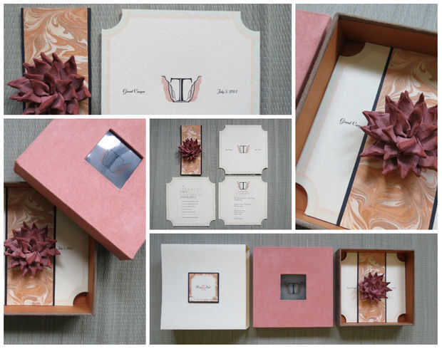 Para todos nuestros efectos de escritorio de la boda, mármol mi papel así que pude personalizar los patrones y colores en el mármol. Papel puede ser de mármol tal una manera simple, barato y rápido usando menos de una botella de $3,00 de almidón líquido encontrado en el pasillo de la ropa de su tienda de comestibles y regado por las pinturas de acrílico. Se utilizó papel marmoleado en invitaciones, etiquetas de postre, favor caja etiquetas y bolsas lino favor. Papel marmoleado es realmente una forma turca de arte, llamada "ebru". Ebru fue una manera fantástica de incorporar la cultura de mi esposo en nuestra decoración de boda.