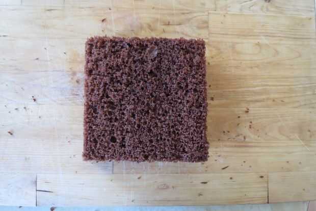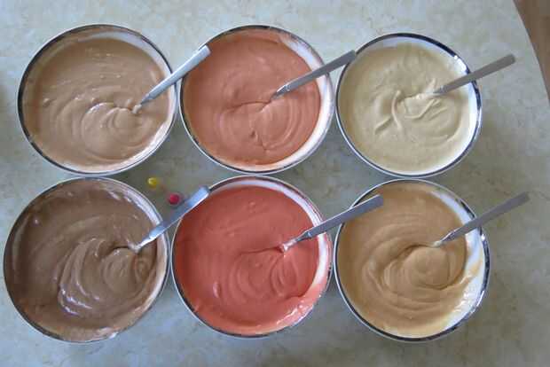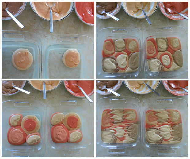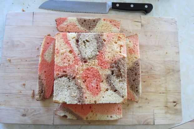 Separe el pastel en lotes y agregar colorante de alimentos. Al azar agregar cucharadas de mezcla de colores en la bandeja para hornear. Ligeramente remolino juntos para un ligero efecto mármol. Después de la cocción, corte y recorte de bordes lejos y parte superior del pastel. Hornear una capa de contraste, si se desea. Nuestra era capas de chocolate para el contraste. Pastel encima de la otra, utilizando palillos para estabilizar los niveles de la pila.