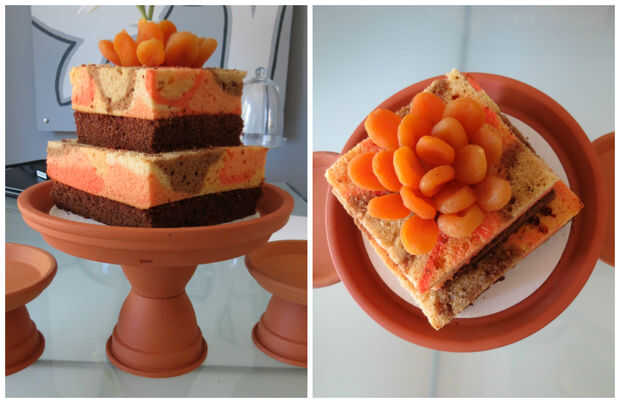 Elegí tener desnudo pastel para nuestra boda no sólo porque desnudo pastel estaba teniendo sus primeros momentos en aquel entonces, sino porque 1) un pastel unfrosted es fácil de transportar y 2) un pastel de unfrosted es prácticamente la única clase que va a sobrevivir en el calor extremo 111F/43 C del gran cañón. Pensé que una torta mármol era una manera perfecta de la incorporación de la torta en nuestro tema. Apilan pastel marmoleado sobre pastel de chocolate sólido a traer algún contraste en el diseño. Como se mencionó en los pasos anteriores, cultura turca de mi marido fue una inspiración, así que con sabor a la tarta con el jugo de albaricoque y cubierto con orejones turcos dispuestos como una flor. Yo había demasiado en mi DIY de la placa que hice un acceso directo mediante el uso de mezcla para pastel en caja, y nadie puede decir porque el zumo de albaricoque había elevado el sabor de la torta.