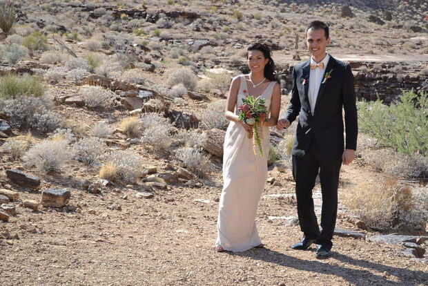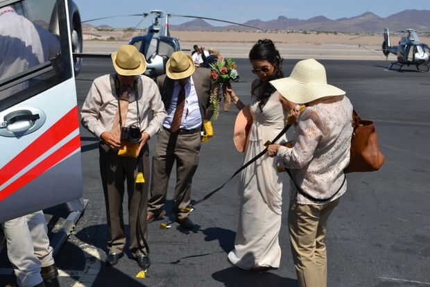 Elegimos Maverick/Mustang para nuestro paquete de boda. Proporcionó un paquete que incluye el vuelo desde su aeropuerto ejecutivo en Henderson, Nevada (también había vuelos disponibles desde Las Vegas, sin embargo, estos son más caros), un ministro, fotógrafo, piloto, limusina del hotel al aeropuerto, champagne y torta de panadería estándar (que no sirven porque la guinda no podía soportar el calor del cañón). Solicitamos 2 helicópteros para que podríamos incluir nuestras familias. Esto terminó costando más que el paquete estándar de un helicóptero.