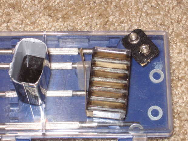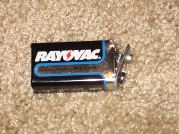 Este no es tan peligroso como parece. Con seguridad puede apalancar el caso de una batería de 9v y utilizarlo para el caso de un proyecto. El real de la batería está dentro de una caja de plástico (o algunos 9v con 6 pilas AAAA en serie). Usé un destornillador y un par de pinzas para remover las entrañas. Mantener la parte superior e inferior de piezas de plástico (las tapas negras), estos se reutilizará para el caso.