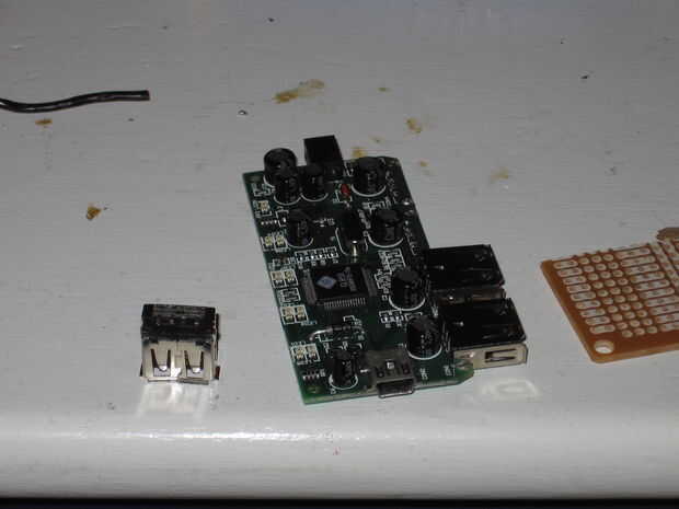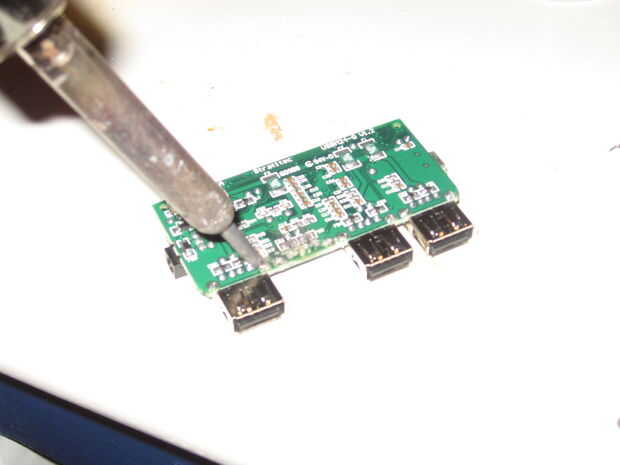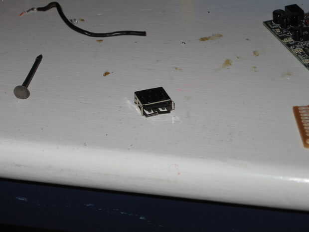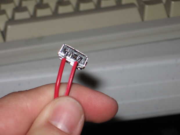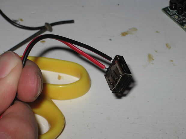 Después de eso, recorte cualquier fichas de soldadura utilizados para mantener el puerto. A continuación, tomar un alambre pequeño (preferiblemente un cable con dos hilos, lo que puede tener tanto positivos como negativos en un cable, pero si no se puede simplemente retorcer las dos solo juntos). Mirando el puerto desde la parte delantera, la parte de plástico debe estar en la parte superior del conector, con los contactos metálicos hacia abajo. Habrá cuatro contactos, el de la izquierda es positivo (5 voltios) y una a la derecha es negativo. Son los dos en el centro de datos, pero este es un cargador, así que los ignoramos. Soldar los cables a la parte posterior del puerto de los conectores izquierdos y derecho, teniendo en cuenta que uno es positivo y que uno es negativo.