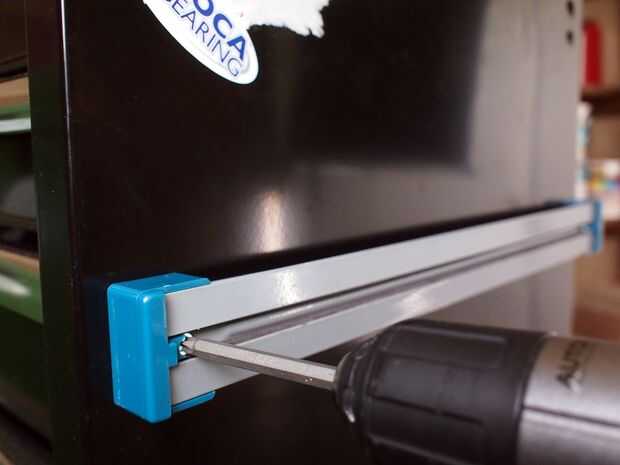 El estante de la herramienta magnética conseguí era 18" y tenía orificios para tornillos que alinearon con la estructura vertical de mi pecho de herramienta. Atornillar en el soporte vertical hueco permite una conexión segura sin interferir con la acción de cajón.