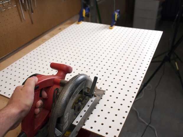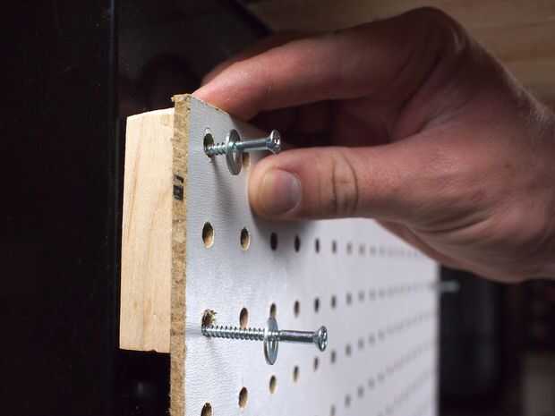 Medí el ancho de mi herramienta de gabinete luego describen el ancho en el pegboard, luego cortado a la medida con una sierra circular. Usé más chatarra arce hacer separadores para que el tablero de clavija se pegaría un poco de la herramienta de gabinete, esto es para que los ganchos de peg pueden ser insertados. Los separadores de madera otra vez se atornillan en el soporte vertical hueco y no interfieran con la acción de cajón.