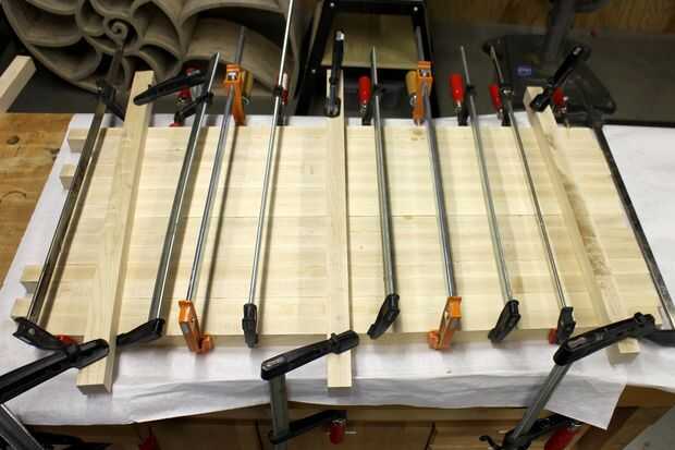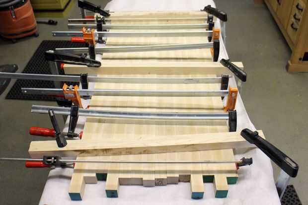 Empecé poniendo abajo de una hoja de papel protector debajo de los listones para evitar pegar la madera al Banco de trabajo. Luego sujeta las piezas con un montón de pinzas para asegurar una buena adherencia entre cada listón. También utilicé unas abrazaderas en piezas laterales de madera cuadrada para que los listones yacían sobre la mesa de trabajo mientras que fue curado el pegamento, darme la superficie más llana a trabajar con después de que el pegamento se ha secado.
