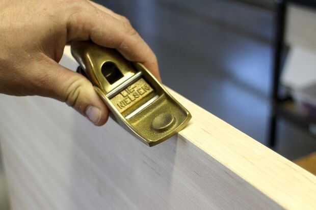 El plano de la mano hace un gran trabajo como tendrá de un afeitado incluso sobre todo el filo, mientras que la lijadora orbital puede tener un chaflán desigual a lo largo de todo el filo. De cualquier manera, nos dirigimos a desprender el borde afilado de la superficie de trabajo.