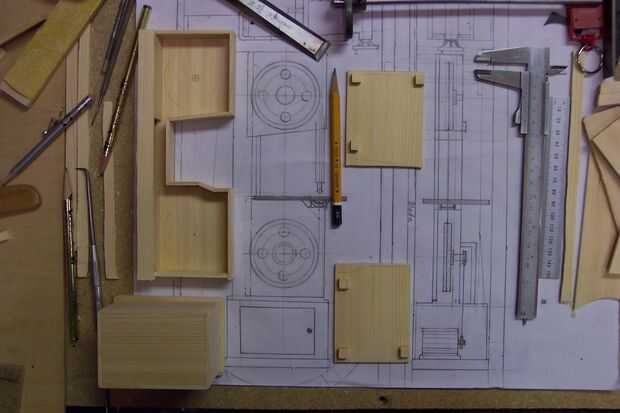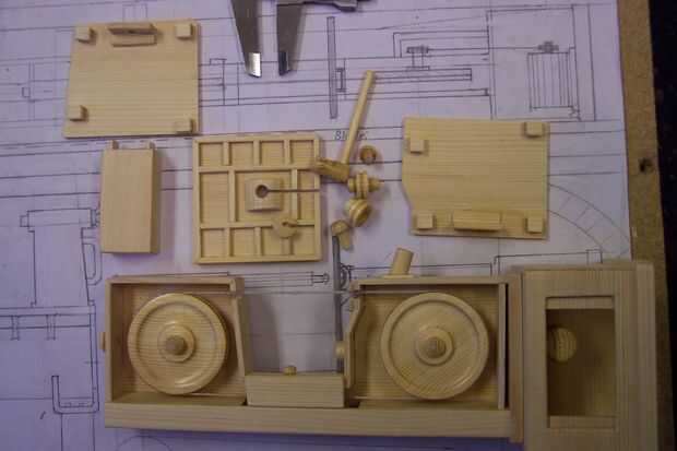 El pegamento CA viene bien, porque tienes que trabajar con los pequeños pedazos finos. Hice el dibujo 1:1 y así puede encajar las piezas para el lay-out. El eje (pins) para las ruedas se giran y son ligeramente más pequeño que el agujero en la rueda, uno quiere ver la rueda girar, al menos no tienes que hacer los rodamientos de bolas. Las piezas planas se pueden lijar en una lijadora de espesor hecha en casa.