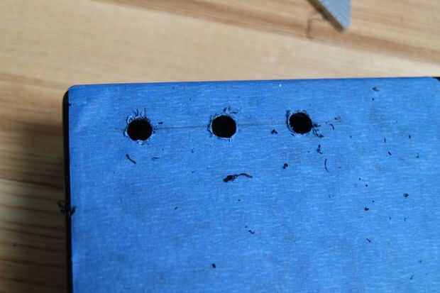 Cubre todo con cinta de enmascarar azul y empezó marcados y perforación de agujeros para los componentes conectados al escudo Arduino.
