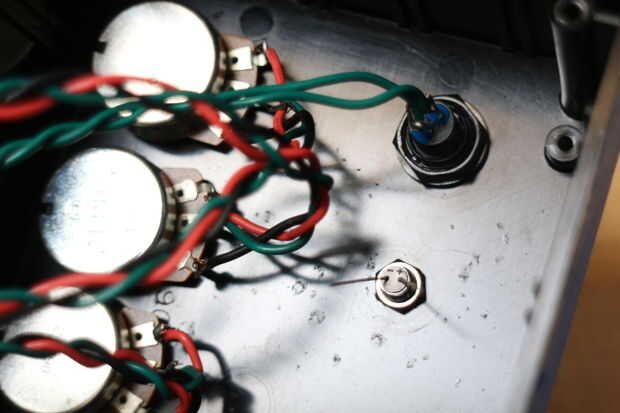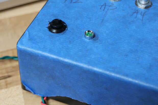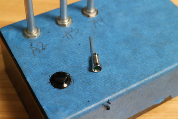 Después de taladrado los agujeros, inserta el interruptor momentáneo N.A. en el recinto, este es el selector que va al Pin Digital 2 de Arduino, así como un LED que se conecta a digital Pin 13 de Arduino - el indicador de modo.