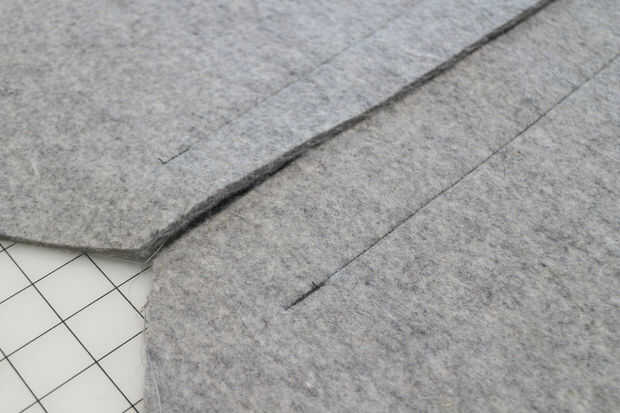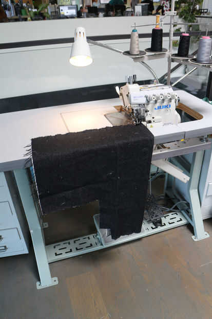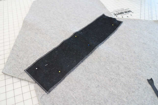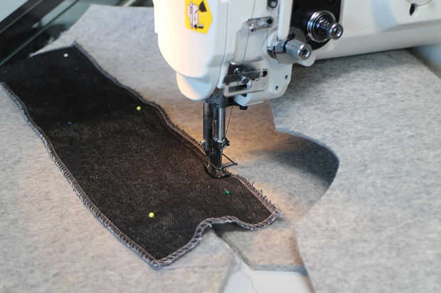 En el recipiente de desecho de la tela, encontré un buen denim negro rígido. Aflojaron hasta una forma rectangular que se convertiría en la bisagra para los dos paneles de fieltro. Volver a usar la máquina de trabajo pesado, había obligado el dril de algodón para el fieltro.