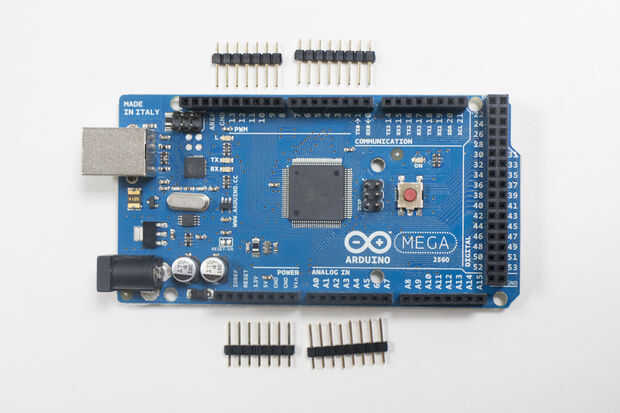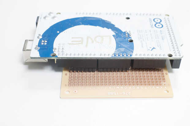 Poner los pasadores de encabezado en el Arduino y descansar boca abajo en el PCB para soldar en su lugar.