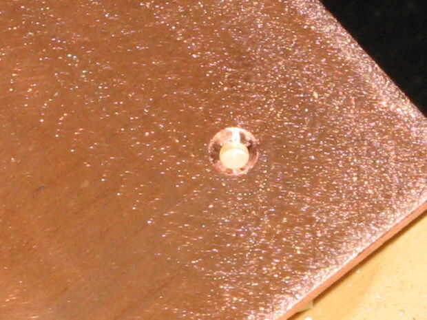 El cobre fue sorprendentemente difícil perforar debido a las brocas desafiladas. Mi papá me dijo que Cruz corte los orificios, lo que significa utilizar un poco más grande para perforar una parte del agujero. Eso es para mantener los tornillos al ras con el cobre.