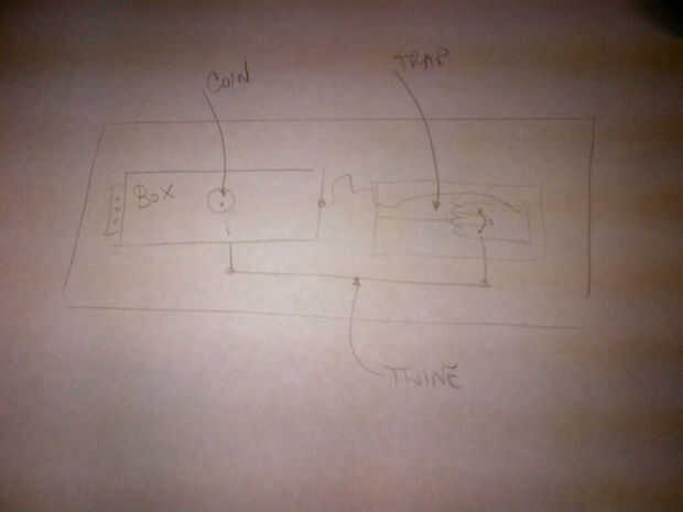 Mi hijo quería atrapar un duende este año. Comenzó con un diseño similar a su hermano, que era básicamente una caja de puerta trampa que fue trampa del ratón activada. Después de algunas deliberaciones, decidimos ir con un estilo de trampa para animales más antiguo que fue trampa del ratón activada (él compró las trampas con su propio dinero ganado duro un tiempo atrás. Debían ser parte del diseño no importa qué!). No puedo encontrar su plan original pero esta es una versión que se utilizó durante la construcción.