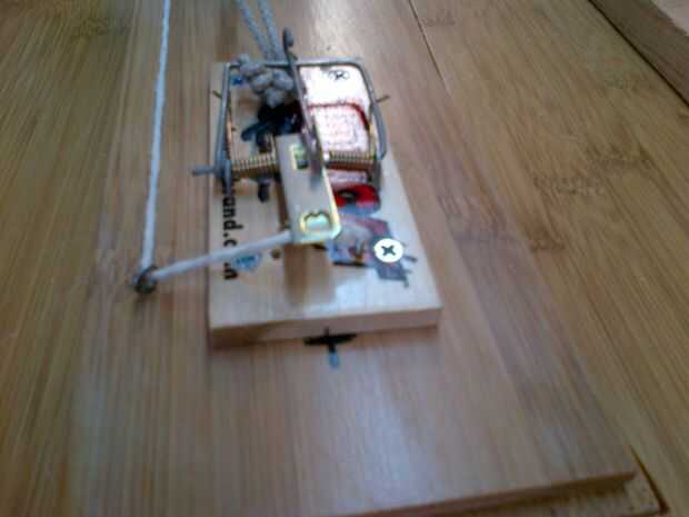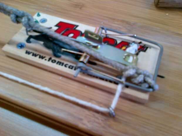 - Aparejado de cable de viaje: una cuerda fuerte fue unida primero a la parte superior de la caja. ATA una corta longitud de espiga en el interior de la caja para evitar que el cable de tracción a través de. El cable fue entonces atado a la bala de bisagra de caída (no estoy segura del nombre técnico para las piezas de la trampa) de la trampa. Nota: carga la bala haciendo los nudos finales para asegurarse de que cuando la trampa se cierra la caja se mantiene firmemente a la base de madera.