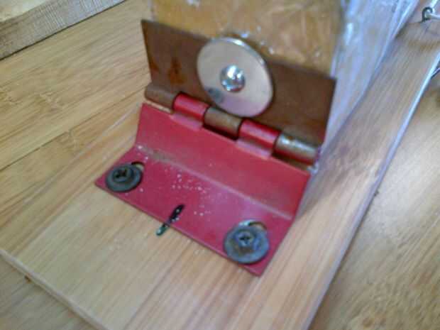 - Fije la bisagra a la madera y la caja: primero el la bisagra fue unida con unos tornillos de cabeza plana pequeño sobre #8 a la Junta. Luego une la caja con un 1/4" tornillo con una arandela grande y una tuerca para sujetar firmemente. Nota: elegimos una bisagra ligeramente rígida por lo que el cuadro estará en su propia en cualquier ángulo.