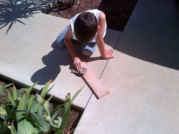 - Cortar y lijar la madera: en nuestro caso la pieza que teníamos era de buen tamaño por lo que nos queda: aproximadamente 4" de ancho por unos 19". Mi hijo hizo un lijado ligero de él para que su trabajo de pintura quedaría bien.