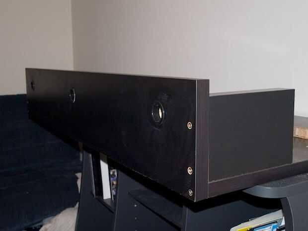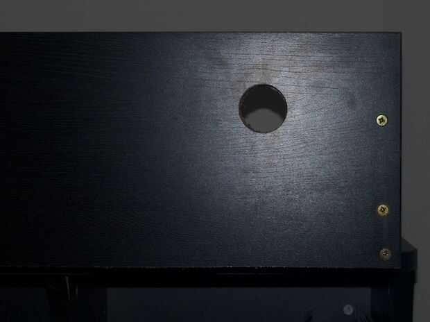 Los orificios perforados en la parte posterior para que los cables de altavoces/potencia etc. a rosca hacia fuera. Sólo Búscate unos plásticos "Escritorio ojales" de ebay y de un sistema de corte del agujero para el taladro y vaya bien. El cortador del agujero era un poco grande para mi los ojales, así que sólo les pegué en la parte posterior al final.