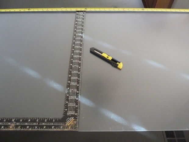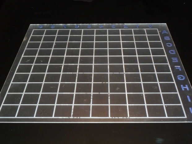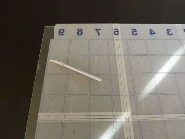 Retire la película de un lado del acrílico sólo. Tome las rejilla grande diseño espalda pegajosa hojas y aplicarlas en el lado expuesto del acrílico. Utilizando un hoja de afeitar afilada quitar pegajoso atrás todas las hojas dejando sólo las líneas y letras.