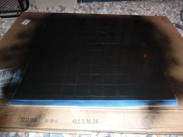 Usando múltiples capas delgadas spray pintura de acrílico expuesto negro. Después de la pintura ya no es pegajosa, pero antes de que haya curado completamente, retire todo el papel restante de sticky back. Usted debe dejarse con nítidas líneas transparente/letras.