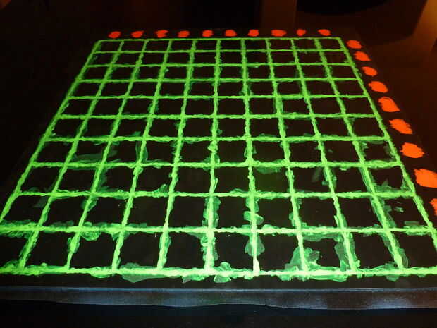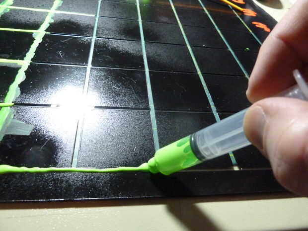 Elegir los colores fluorescentes que desee y comenzar la pintura en todas las áreas transparentes. Es difícil pintar sobre Plexiglas. Al principio tuve que usar múltiples capas, establecen tanto la pintura como pude con cada paso. Más tarde descubrí que pintar las líneas de división era mucho más fácil al utilizar una jeringa pequeña.