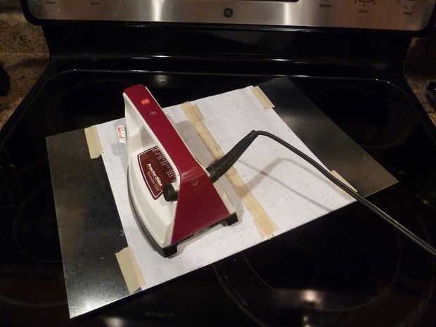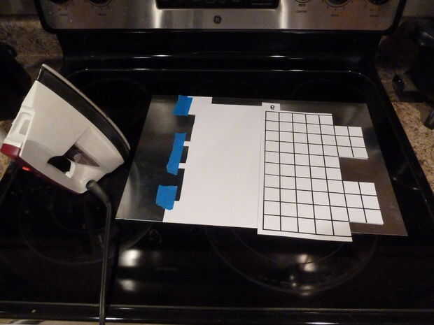 Coloque la plancha en la posición más alta, con vapor apagado. Comience a planchar el papel al metal aplicando presión y calor. Revise periódicamente para ver qué áreas necesitan más atención. Una transferencia de tóner perfecto no es necesaria, sólo lo suficiente para ayudar a alinear la cinta que va a utilizar para la construcción de la red.