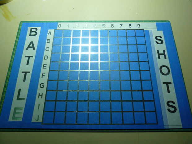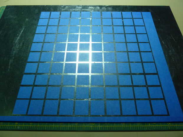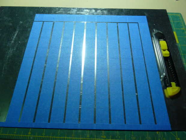 Colocar las tiras de cinta de 1" pintor siguiendo las pautas de cuadrícula en la hoja de metal. A continuación, utilizando una escuadra y hoja de afeitar, corte las líneas a través de la cinta en las líneas de guía horizontales. Retire la cinta sobrante y debe tener una cuadrícula formada por piezas cuadradas de cinta. A continuación, colocar las piezas restantes de stickyback alinear con la rejilla de la cinta. Utilizando un hoja de afeitar afilada quitar el deletreado negro.