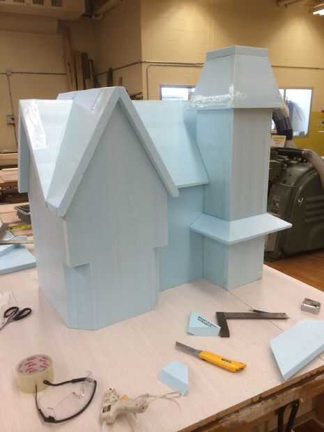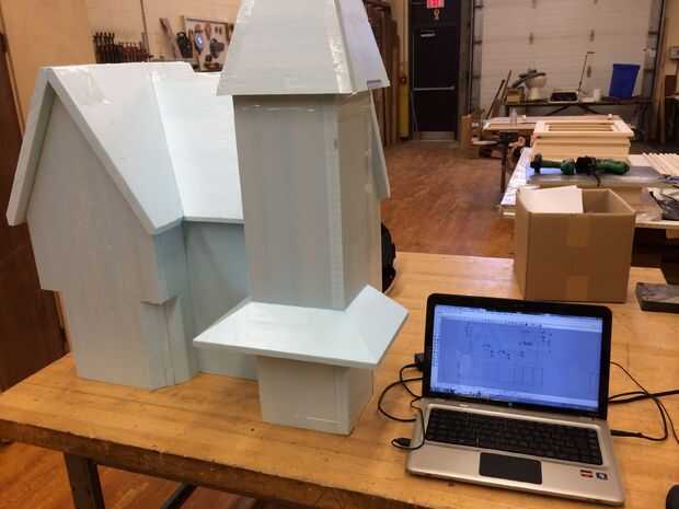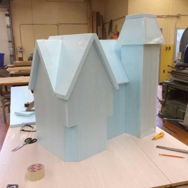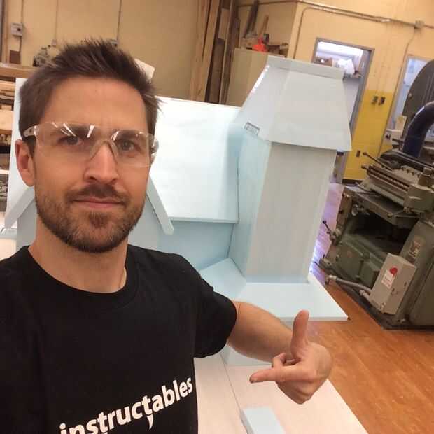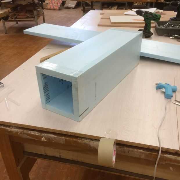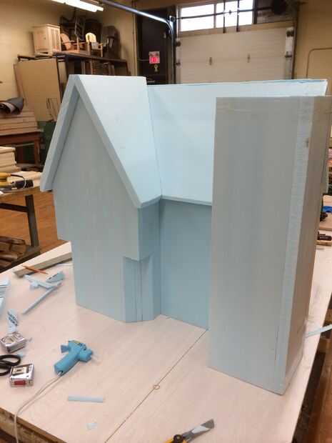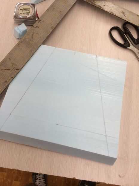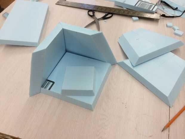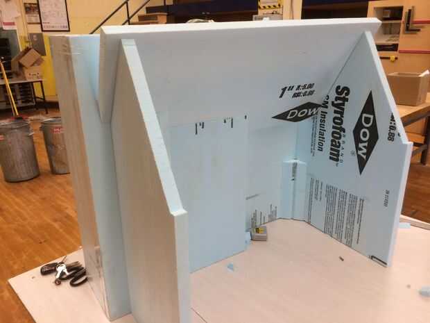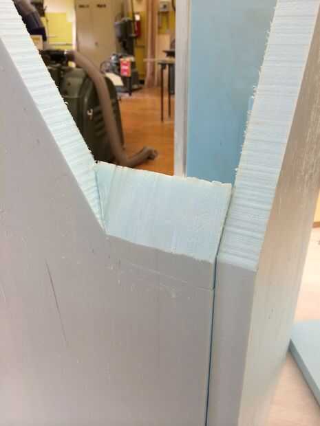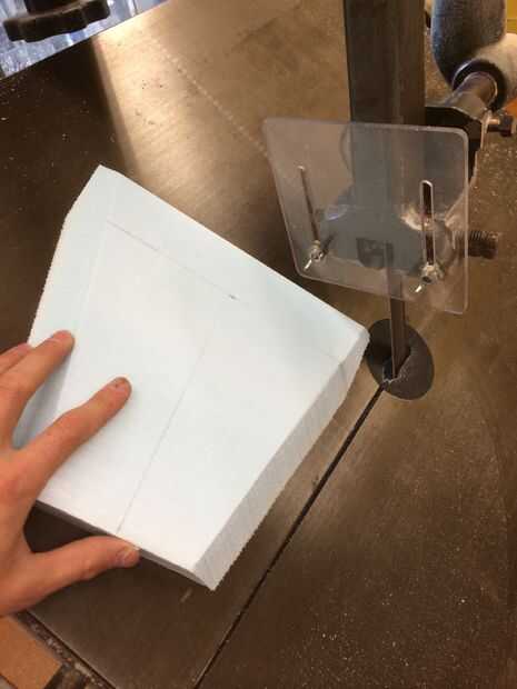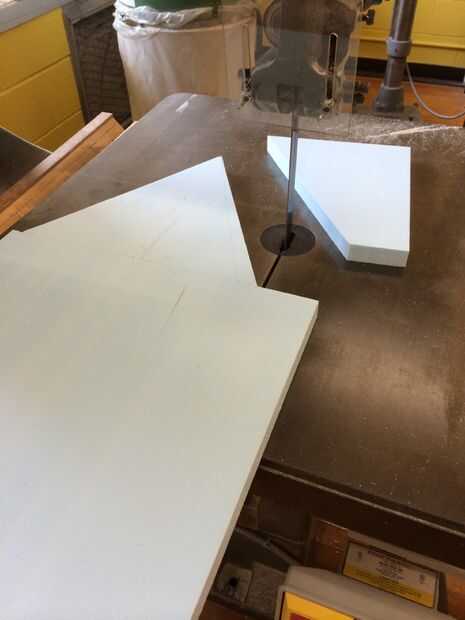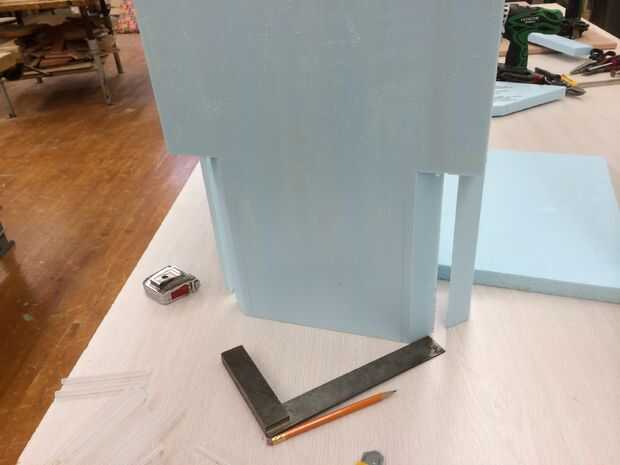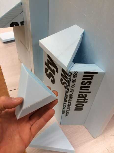 Siempre corro detrás de mi viejo amigo espuma azul en traje del tiempo de construcción. Es barato, fiable, fácil de trabajar, y lo más importante, es ligero. Hay muchas maneras para cortar espuma azul. Me gusta usar la Sierra de mesa y una gran Sierra para cortes rectos y precisos, pero se puede utilizar un cuchillo y una regla. Incluso un serrucho trabaja bien en un sujetador. Su mejor amigo en esta situación es un programa de modelado en 3d. Aunque el modelo parece bastante sencillo, los ángulos pueden hacer para arriba. Me encontré tirando constantemente mediciones desde el modelo 3d con el fin de ayudarme a configurar mis máquinas a los ángulos rectos.