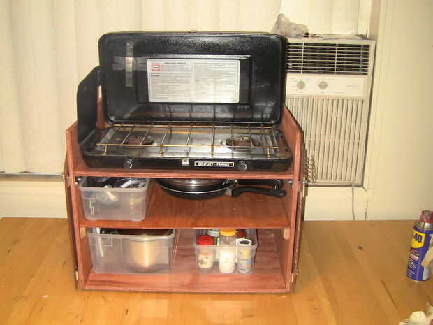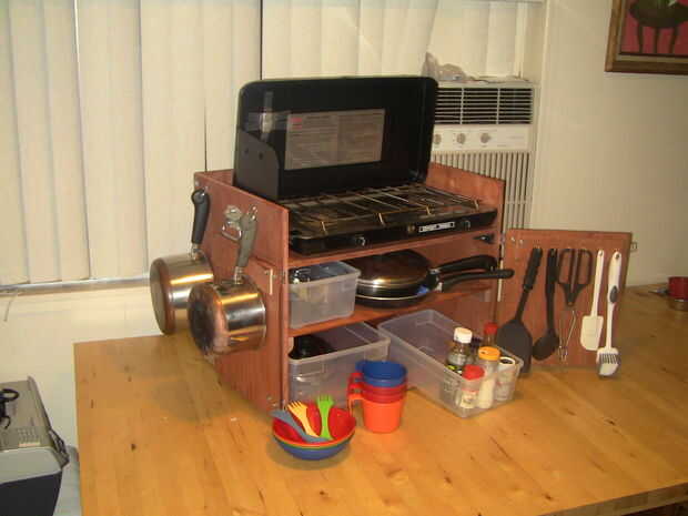 Hay dos grandes cambios de la mayoría de las cajas. En primer lugar la parte superior es abierta, esto permite un fácil acceso a la estufa y me recuerda a los viejos autobuses de Volkswagen que habían construido en estufas. En segundo lugar, las puertas delanteras abren al lado en vez de caer. Mayoría de la gente piensa que es bueno tener un espacio de trabajo delante de la caja pero creo que el desplegable de la tabla hace que sea difícil llegar a la estufa. Cuando esta casilla está sentado en una mesa de picnic, uso la tabla como un espacio de trabajo y puede llegar fácilmente a la estufa.