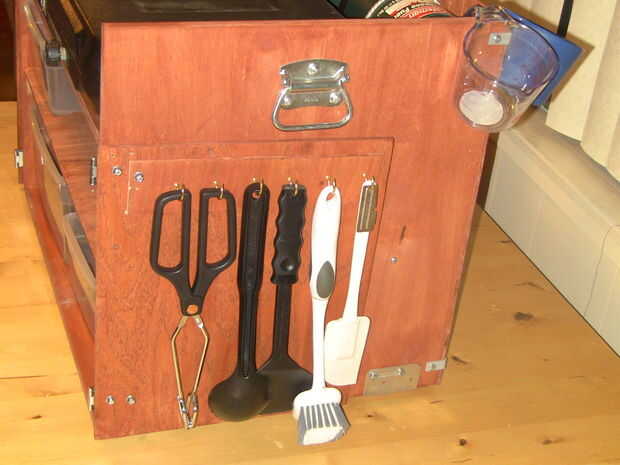 La caja contiene todo lo que necesito para cocinar, limpiar y servir para 4 personas. En el campo, las macetas de colgar en el lado izquierdo para secar y la espátula y otros utensilios de la caída a la derecha. Hay un cilindro de propano de repuesto detrás de la estufa y los envases de plástico se utilizan para lavar los platos.
