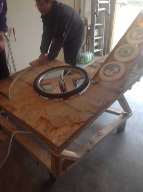 Estudio Dibujo 6. Este es el marco de fondo que guarda la máquina de equilibrado. El marco se compone de montantes de madera de 2 x 4 formando un trapecio con una viga transversal. Utilice una cinta métrica y lápiz de madera para medir y marcar las vigas que se unen en ángulo recto (parte inferior, izquierda y derecha). Más tarde llegaremos a la viga superior. Recuerde restar 3,5 pulgadas de algunas de las medidas para tener en cuenta el ancho de las vigas en las intersecciones. Cuidadosamente use una sierra circular o sierra de mesa para hacer los cortes perpendiculares. Espere hasta más tarde para hacer los cortes angulados. Pone las vigas de corte medido sobre el terreno en el mismo arreglo como en el plan de acción. Pone una viga sin cortar en la parte superior del marco. Esta será la pieza angular. Marca dónde están los bordes de las otras vigas en la pieza sin cortar. Marque los extremos de las otras piezas para que coincida con el ángulo. Corte a lo largo de las marcas. Ahora debe tener el borde 4 piezas cortan por lo que les corresponde según el plan de acción. Elija una esquina del marco. Fije los dos haces otra y utilice un taladro eléctrico para hacer 2 agujeros de guía en una esquina del marco según la señal de marcas en el plano. Taladro tornillos de madera de 4 pulgadas en los orificios de entrada. Repita los pasos 9 -10 en cada esquina del bastidor. Coloque otra viga sin cortar a través de la estructura. Se trata de la viga transversal. Marcar los bordes del marco en la nueva viga. Corte a lo largo de las marcas. Taladrar agujeros de guía en cada extremo de la viga transversal. Asegúrela con el tornillo de madera de 4 pulg. Verificar las dimensiones de la estructura terminada y para asegurarse coincida con los planos. Colocar dos ruedas en la base de la distorsión trapezoidal según el dibujo. Puede ser necesario encontrar tornillos con cabezas más amplios para adaptarse a los agujeros en las ruedas. Medir la altura de la rueda y cortar dos haces de igual altura. Tornillo en el bastidor con 2 tornillos para madera cada uno según el dibujo. B. el lanzamiento superficie marco atentamente dibujo 5. Esto forma el soporte para la superficie de lanzamiento inclinado. Está hecho de un marco de lados 6 construido de vigas de madera con vigas cruzadas 3. El paralelo transversal 2 se utilizan para sostener el motor principal (el taladro). Mida y marque la longitud de las vigas exteriores en piezas del perno prisionero. Recuerde restar 3,5 pulgadas si es necesario. Corte cuidadosamente a lo largo de las marcas. Organizar las piezas en el suelo según el plan de acción. Después de asegurarse de que todas las piezas encajan, comenzar a armar el marco. Taladrar dos agujeros guía e inserte 4 tornillos para cada articulación según el plan de acción. Pone un rayo largo sin cortar a través el marco según el plan de acción. Se trata de la viga transversal. Marcar los bordes del marco en la viga sin cortar. Tenga en cuenta que la viga puede superponerse en el medio, así como en los bordes. Corte cuidadosamente a lo largo de las marcas. Instale el travesaño taladrar agujeros guía e insertando 2 4 tornillos en cada extremo de la viga. Verificar las dimensiones de la estructura terminada y para asegurarse coincida con los planos. C. el estudio superficial de lanzamiento dibujo 1. Esta es la parte superior del lanzador de disco volador. Consta de una superficie de madera contrachapada con una rueda de bicicleta de spinning y una pista curvada. El Frisbee se mueve en la pista curva y será lanzado por la rueda de la bici. Coloque un gran pedazo de madera contrachapada sobre el piso. Dibujar los bordes de la pieza más grande de la madera contrachapada que cubre perfectamente la estructura superficial del lanzamiento. Corte a lo largo de los bordes con una sierra de calar. Ahora encontrar el punto en la madera donde será el centro de la rueda de la bici. Debe ser 24,75 pulgadas desde la parte inferior y 24 desde cualquier lado. Marque este punto claramente. A continuación cortar un agujero alrededor de este punto bastante grande que el neumático de la bici cabrán dentro de él sin raspar los bordes. Atar un trozo de cuerda a un lápiz para que la cadena es apenas tiempo suficiente para llegar desde el centro de la rueda hasta el borde exterior de la llanta. Sostenga el extremo suelto de la cadena en el punto en la madera donde será el centro de la rueda. Swing el extremo del lápiz de la cuerda en un círculo completo, partiendo de la madera contrachapada. Utilice un taladro equipado con una broca de corte de agujero para hacer un pequeño agujero cerca de la parte interior borde del círculo. Inserte la hoja de una sierra de calar en el agujero y corte alrededor de todo el camino a las afueras de la línea de lápiz. 7. Coloque la madera cortada en el marco y atornillar utilizando tornillos para madera corta. 8. Voltee la superficie de lanzamiento por lo que la madera es en la parte inferior. 9. cortar 3 rebanadas gruesas de pequeñas pulgadas ½ de viga para atornillar en el lado derecho largo de la estructura según los dibujos. Estos forman las muescas de los brazos ajustables más tarde. Los otros 3 se instalará más adelante. D. preparar la broca para montar el motor principal que gira la rueda de la bici es un taladro con cable eléctrico. Con el fin de controlar la velocidad de la rueda de la bici, el taladro se conectará a un atenuador, el atenuador se conectará a un servo y el servo será controlado por el Raspberry Pi. El primer paso es conectar el taladro con el atenuador. Asegúrese de que el taladro esté desenchufado cuando trabajas en él. Desembale su atenuador. Usted verá 3 cables, 1 verde y 2 negras. El cable verde es para ser utilizado como un campo, pero será innecesario porque ya está conectado a tierra nuestro taladro. Energía para el motor del taladro se ejecutará entre los cables negros. Tomar la mitad del plástico taladro c