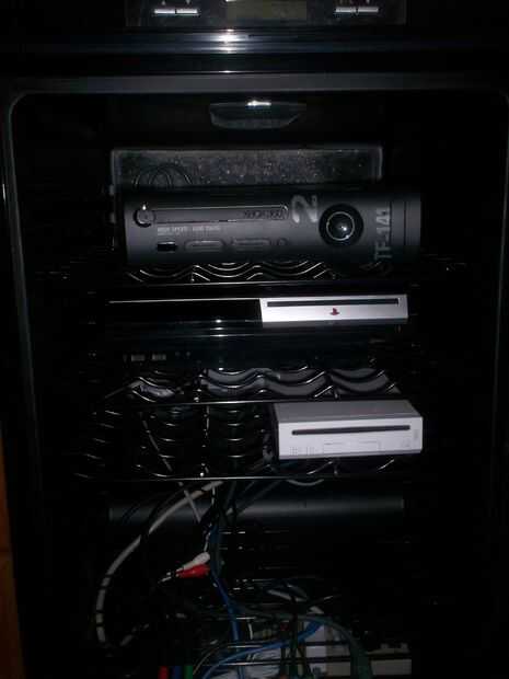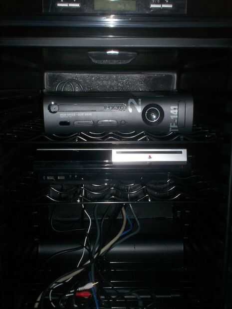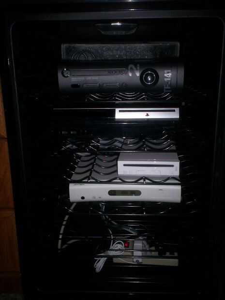 Asamblea es bastante fácil. · Quite los estantes superior · Retire la rejilla de ventilación / taladrar el agujero para los cables en la parte posterior de la unidad · Correr los cables externos a la TV, el receptor y la red a través del orificio en la espalda · Instale la tira de la energía, concentrador de red y conmutación AV en la unidad. o colocación depende de usted. La parte inferior de mi nevera de vino también tiene el compresor - para que la plataforma no va hacia la parte posterior y que no mantendría una consola de juego completo, así que puse todas las fuentes de alimentación en la parte inferior o que estos equipos adicionales pueden instalarse más en la unidad como el aire más frío será en el fondo – y desea que sus consolas cerca el aire más frío como posible o es una opción para agregar un ventilador en la unidad para crear un flujo de aire circular a través de la nevera. Esto le permitirá poner sus dispositivos en cualquier lugar en el refrigerador y todavía obtener el beneficio completo del refrigerador aire · Coloque el estante más alto con la videoconsola, que los cables a lo largo de la parte trasera de la nevera el centro AV de conmutación y red. Esto le permitirá quitar los estantes como necesite sin nuevo cableado cada consola · Encontrar la altura necesaria para la próxima consola, inserte la rejilla a la altura correcta y la 2 º consola de alambre a la unidad AV / red hub, una vez más, mantener los cables en la parte trasera de la nevera y evite pasar los cables a través de la abertura en el alambre bastidores · Repita el proceso hasta que todas sus consolas se instalan en racks, conectados a la unidad AV / concentrador de red y conectado a la regleta. Una vez hecho esto, conecte los Cables AV desde el refrigerador al televisor / receptor, conecte el refrigerador de vino en y luego la tira de alimentación. Nota: si es posible, conecte el refrigerador de vino a un circuito eléctrico diferente que el la tira de alimentación para las consolas. Esto ayudará a distribuir la carga y evitará un interruptor disparado.