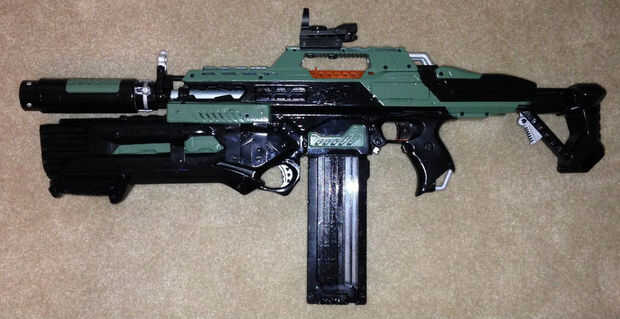 ¿Tienes una abundante cantidad de tiempo? ¿Eres adicto a Nerf? ¿Crees que dos son mejores que uno? Si usted dijo que sí, que esto es para ti. Este instructable muestra la Unión de un Nerf Rapidstrike CS-18, a un Roughcut. Además de participar en el I agregó un tercer puesto a la población, modificó los volantes y había añadido una óptica. Para ello utilicé otros instructables y varios videos de youtube por Coop772 para ayudarme hacia fuera.
