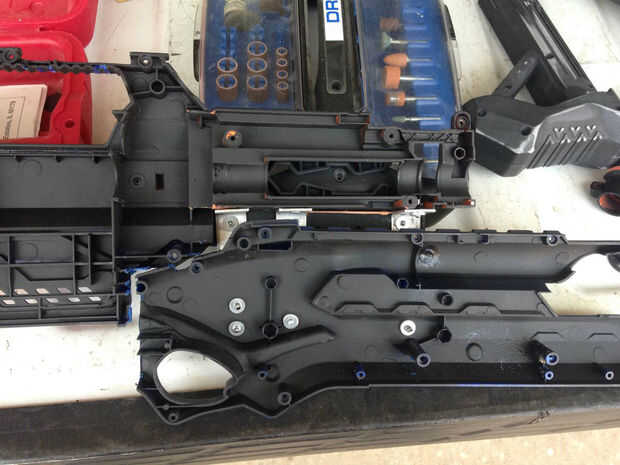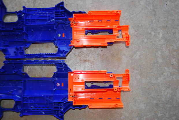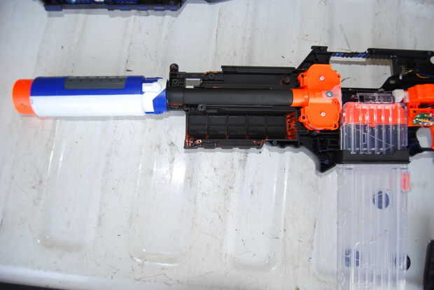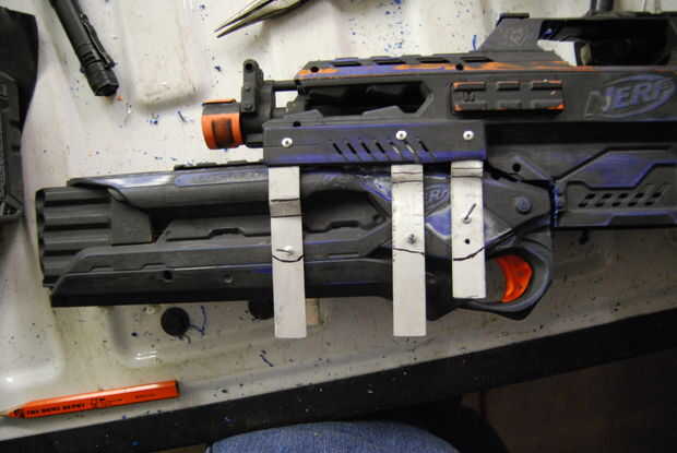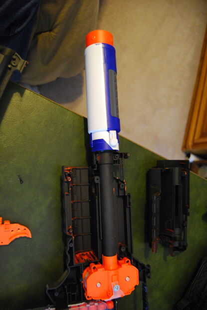 Nota: quise utilizar la extensión de cañón del supresor de nerf, por lo que el roughcut tuvo que ser montado más bajo. La anchura de la roughcut es casi perfecta para el rapidstrike con batería naranja caja lo quitado.