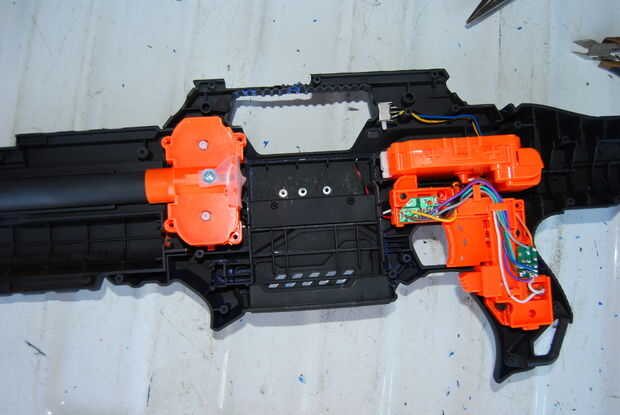 Si funciona todo, luego agregar los tornillos de montaje del motor, el conjunto del gatillo y ensamblaje de empuje.