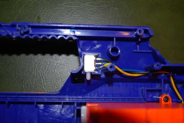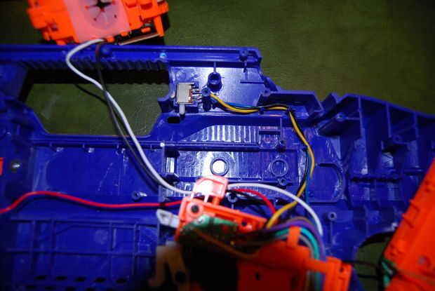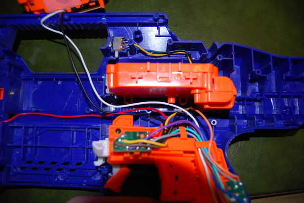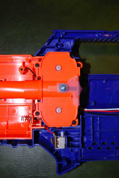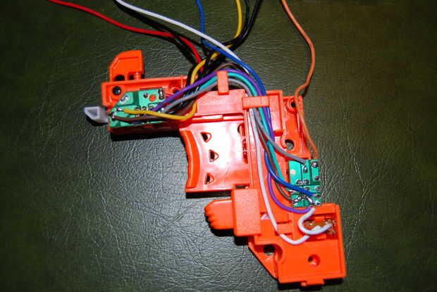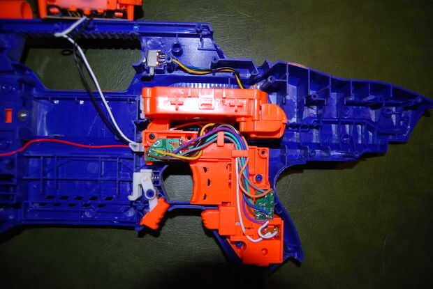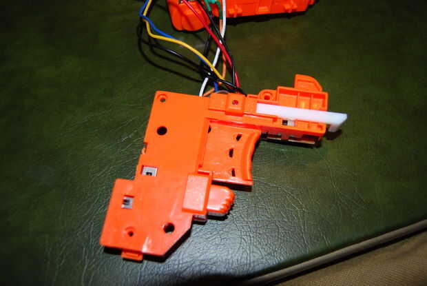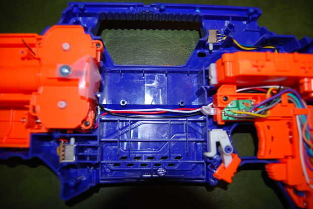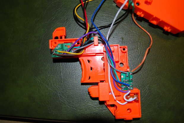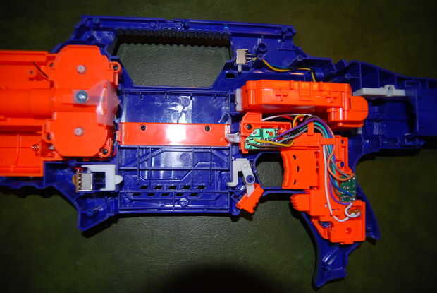El montaje del motor tiene cuatro tornillos que la sujetan, el conjunto del gatillo tiene algunos... No recuerdo cuántos, y el mecanismo del brazo de empuje también tiene algunos. Llevarlos hacia fuera y tire de la electrónica de la cáscara de la pistola.