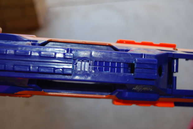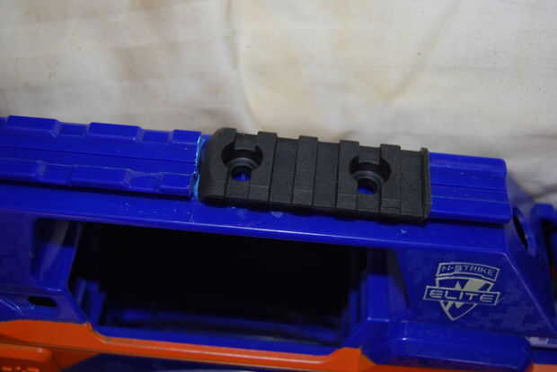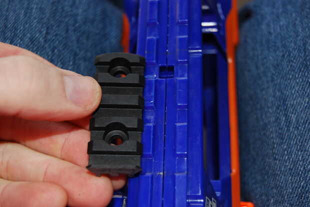 Después de cortar el riel de Magpul, coloqué encima de la pistola de Nerf y marque los extremos. Tomar una dremel y luego cortar la sección del riel hacia fuera de modo que quepa comodamente. Luego tomar una broca que sea del mismo diámetro que el tornillo para el montaje y perfore a través de la pistola de Nerf. Luego tomó el tambor de lijar de la dremil y enarenar hacia fuera de los bordes por debajo de los agujeros para que la montura se adapta cómodamente.