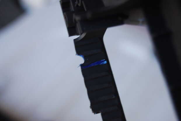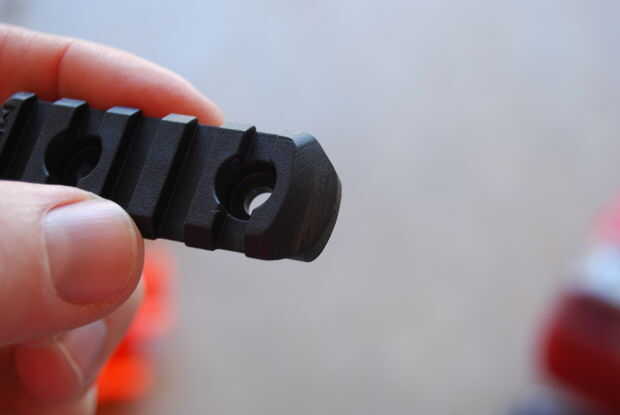 Quería mantener la máxima cantidad de integridad estructural de la sección del riel superior, así que decidí montar el riel entre dos secciones del tornillo. Para ello iba a tener que cortar un poco del carril de Magpul. He marcado en él con un lápiz y utilizar una dremel con un disco de corte para hacer el trabajo. Orienté el carril para que los orificios de tornillo también trabajaría con el ángulo del travesaño.